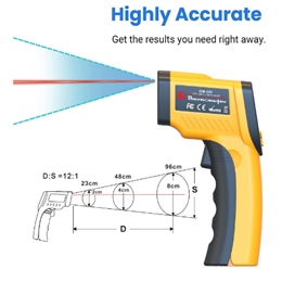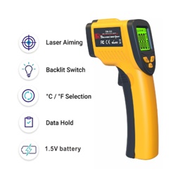 Este termómetro láser infrarrojo se utiliza para medir la temperatura de la superficie del objeto, que es aplicable para varios objetos calientes, peligrosos o difíciles de alcanzar sin contacto de forma segura y rápida.